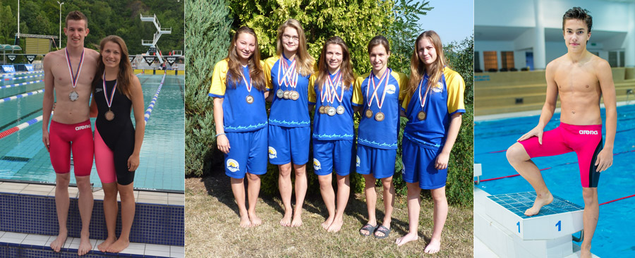Gabriela získala stříbro na 50 a 100 volný způsob, Monika si doplavala pro stříbro na 100 znak a pro bronz na poloviční trati. Tři setiny sekundy chyběly Gabriele k medaili na 50 znak, když dohmátla čtvrtá a na 200 volný způsob, kde doplavala pátá. Monika přidala ještě 7. místo na 200 znak. Trenérka Hana Macková byla s jejími výkony nadmíru spokojená: „Monika odjížděla na mistrovství s tabulkovými umístěními kolem desátého místa. Tajně jsem doufala v účast ve finále. Mnohasekundová zlepšení osobních rekordů nakonec znamenala dvě nečekané medaile a atakování limitu české juniorské reprezentace na 100 znak, kde jí ke splnění chybělo 37 setin vteřiny.“ Medailovou sbírku završily dívčí štafety na 4x100 polohový závod a 4x100 volný způsob, které vybojovaly bronzové medaile. V obou štafetách tvořily základ studentky našeho gymnázia Monika Langerová, Gabriela Chudárková a Petra Vybíhalová ze 3. D. Další cenná finálová umístění v nových osobních rekordech potvrdila dobrou formu našich dorostenců. Výborné šesté místo vybojoval benjamínek výpravy 15letý Martin Klusal na 200 volný způsob. Jan Slíva z 2. D obsadil na 50 a 100 motýlek shodně 8. místo, stejně jako Petra Vybíhalová na 100 volný způsob. Úspěšnou bilanci uzavřela dvěma 8. místy štafeta dorostenců na 4x100 polohový závod a 4x100 volný způsob, v jejíž sestavě startovali Jan Slíva, Matěj Zábojník a Martin Klusal. Matěj a Martin nastupují v září do nové 1. D. Přes výrazný medailový zisk viděl trenér Vilém Čejka i určité rezervy: „V sobotu postihla Gabrielu akutní střevní viróza, která jí nedovolila podat optimální výkon na kraulové dvoustovce, když doplavala hluboko za osobním rekordem pátá. Kvůli její indispozici jsme odhlásili i štafetu děvčat na 4x200 volný způsob. V sobotu nám tak utekly další dvě téměř jisté medaile.“
