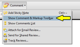 Rozbalovací položka "Comment" v Adobe Acrobat