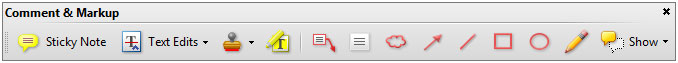 Podívejme se nyní na tuto rozklikávací položku v programu Adobe Acrobat. Jednotlivé položky si rozebereme za chvíli, zaměřme se ale nejdříve na položku "Show Comment & markup Toolbar". Když na ni klikneme, objeví se nám panel, který je vidět na obrázku níže.