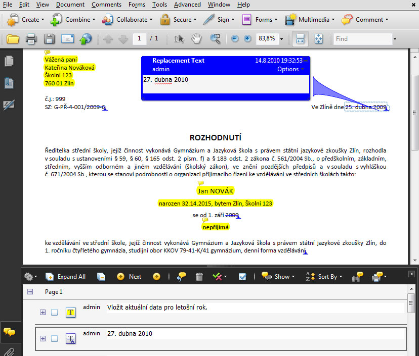 To však lze řešit prostřednistvím programu Adobe Acrobat a my si nyní ukážeme jak. Budeme mít tedy šablonu dopisu v elektronické podobě, ale místo abychom ji vytiskli, převedeme ji do souboru PDF a tento soubor pak odešleme ke korekcím. Předpokladem pro takovouto elektronickou korekci je jedna licence programu Adobe Acrobat, v našem případě u člověka, který má na starosti elektronické zpracování dat pro přijímací řízení. Ten pak po převodu šablony dopisu do PDF zprovozní funkce komentářů a poznámek také pro program Adobe Reader, který je k dispozici zdarma a v současné době je v podstatě samořejmostí na všech počítačích.