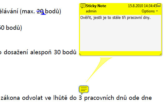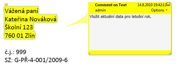 V následující ukázce je pak předvedeno použití poznámek a komentářů v reálu. Jednotlivé nástroje si předvedeme na další krátkých ukázkách názorně, teď však pro lepší představivost máme k dispozici zmíněný dokument v kterém probíhají poznámky a komentáře pomocí příslušných nástrojů programu Adobe Acrobat, respektive Adobe Reader (pokud jsou za pomoci programu Adobe Acrobat zpřístupněny i uživatelům Adobe Reader). V ukázce vidíme zvýrazněný žlutý text, ke kterému se vztahuje poznámka, aby zde byla vložena aktuální data pro letošní rok. Dále je zde vidět přeškrtnutý text u kterého je poznámka, jaký text zde má být uveden (např. změna starého data na letošní aktuální). Na všechny poznámky se pak můžeme podívat v dolní části pracovního prostředí, kde je za tímto účelem jakýsi manažer těchto poznámek a komentářů, takže si můžeme jakékoliv takové poznámky a komentáře prohlédnout v celém dokumentu postupně jednu za druhou.