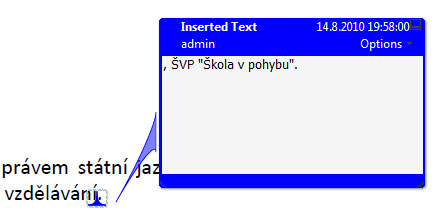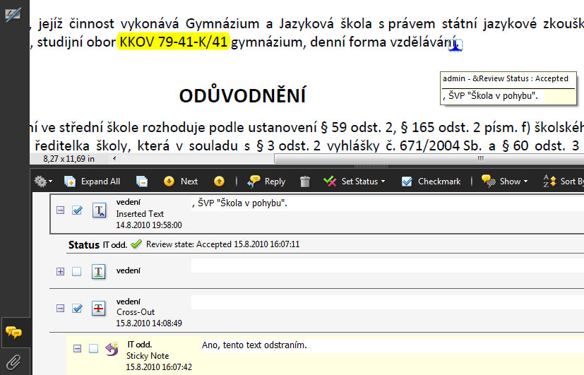 Ještě si předvedeme práci s tímto panelem, kdy vidíme, že probíhá nějaká komunikace mezi vedením a IT oddělením. Vidíme, že je označena položka, kde má být vložen text. Máme zde uvedeno o jaký text se jedná a při označení této položky se nám vyobrazí přímo v dokumentu, jak je vidět na obrázku. Vidíme, že je zde také modře položka odškrtnuta. Toto zatržítko ovšem slouží pro člověka, který si dokument prochází, aby si dělal poznámky, které komentáře už prošel a přečetl. Jiný přápad je, když vidíme, že je dole status od IT oddělení se symbolem zelené frčky. To znamená, že změna byla akceptována a provedena. Dále pak vidíme, že vedení chce odstranit nějaký text. Hned podtím je přidaný komentář, že IT odddělení bere toto na vědomí a že text odstraní.