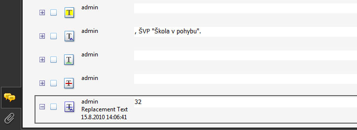 V tomto panelu pak máme přehled všech poznámek a komentářů. Na obrázku je vidět pět takových příkladů, kdy nejdříve vidíme text označený, pak text vložený, dále podtřžený, určený k vymazání a jako poslední text, který bude přepsán.