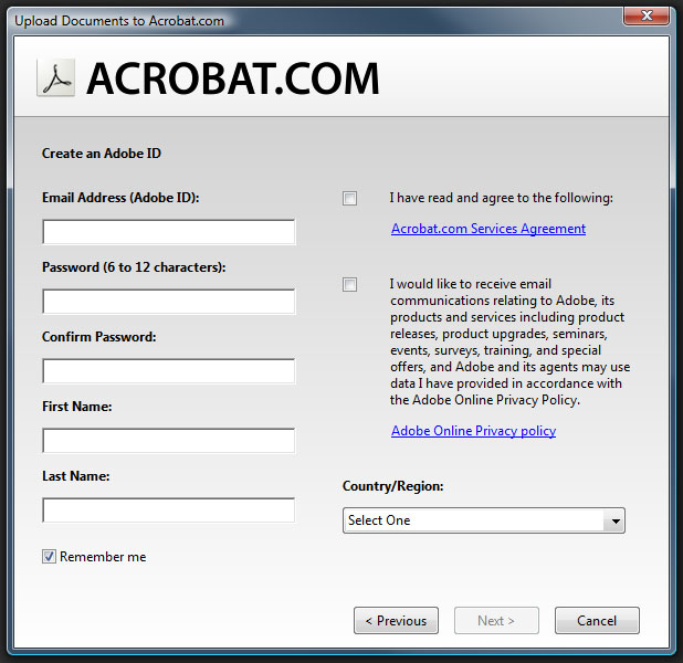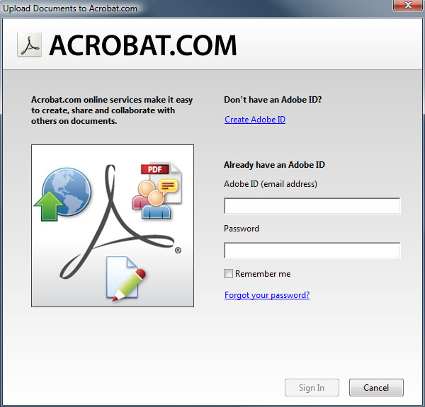 Abychom mohli využívat funkce spojené se sdílením souborů a spoluprácí, je nutné se nyní přihlásit k serveru acrobat.com, tedy vyplnit vaši e-mailovou adresu jako identifikátor a zadat vaše heslo. V případě, že se k tomuto serveru připojujete poprvé a nemáte tedy založený účet, klikněte na "Create Adobe ID", viz následující obrázek.