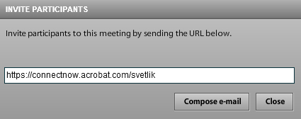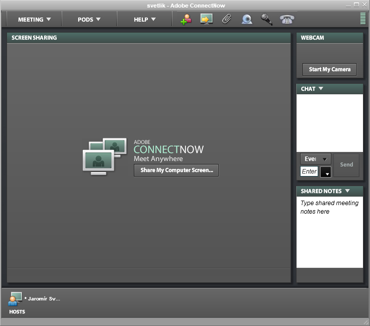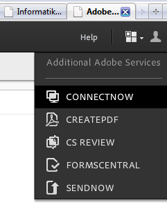 Sdílení obrazovky. Řeší se na serveru acrobat.com v pravém rohu, kde je nabídka (čtverečky s malou šipkou) s různými možnostmi, zvolíme položku "connectnow".