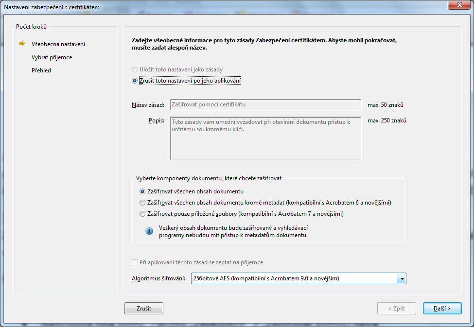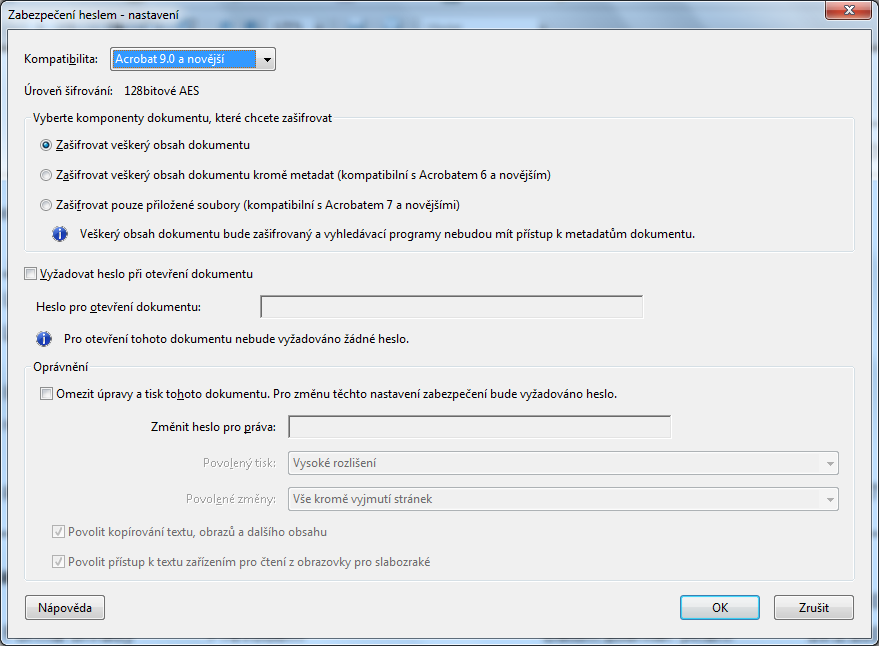 Stejně jako v předchozím případě nabízí aplikace Adobe Acrobat možnost nastavit, co vše má být zašifrováno (zda dokument s metadaty, dokument bez metadat nebo pouze přiložené soubory) a jaké šifrování má být použito.