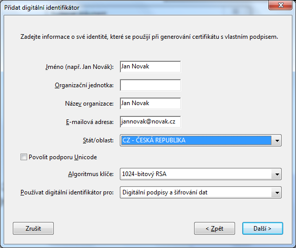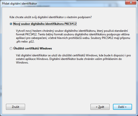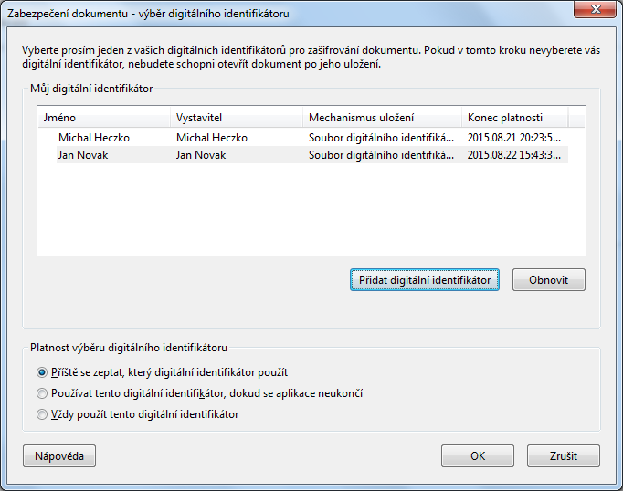 V dalším kroku následuje výběr certifikátu. Zobrazí se seznam certifikátů s možností vytvořit vlastní identifikátor. Navíc je možnost nastavit tento identifikátor jako výchozí i pro další šifrování.