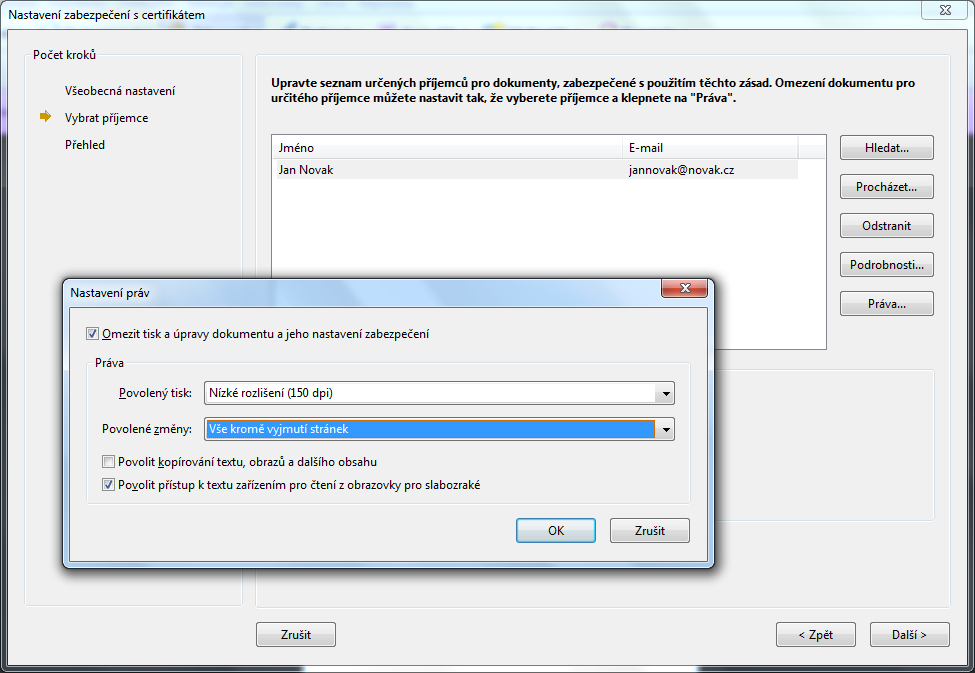 Po výběru certifikátu je možno ještě nastavit práva tohoto příjemce (toto nastavení je velmi podobné nastavení u použití hesla.