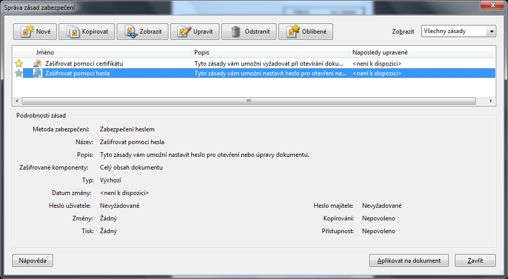 Po spuštění dialogového okna se zobrazí seznam existujících zásad zabezpečení (ve výchozím nastavení existují dvě: „Zabezpečení pomocí hesla“ a „Zabezpečení pomocí certifikátu“), kde lze jednoduchým způsobem přidat nové. Následný postup již bude velmi podobný výše popsanému zabezpečení pomocí hesla nebo pomocí certifikátu.