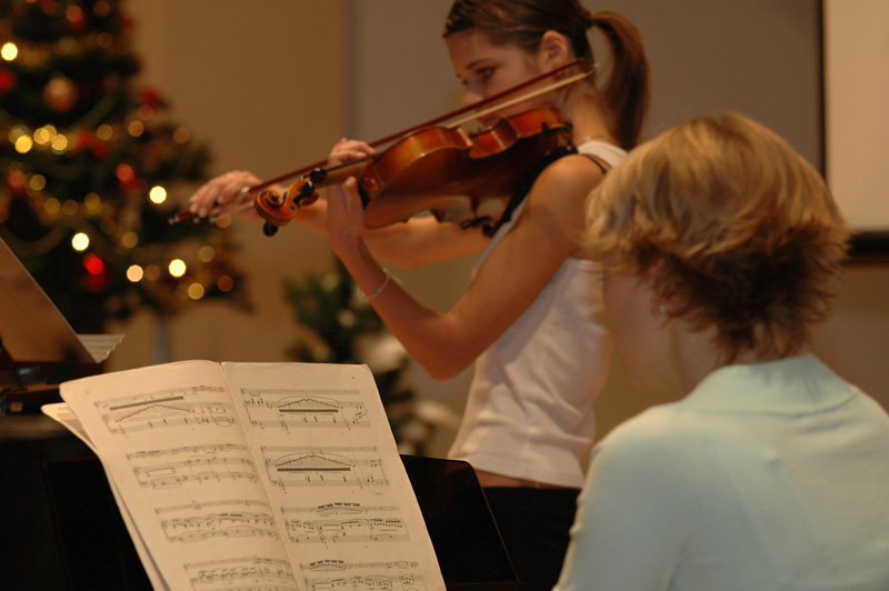 Vidíme, že byla použita nižší clona, a proto byla snížena hloubka ostrosti – bylo zřejmě zaostřeno na noty na klavíru, houslistka je pouze mírně rozmazaná, ovšem stromečky v pozadí jsou rozmazané dost. Tuto techniku je vhodné použít pro optické oddělení popředí od pozadí.