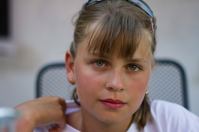 Opět velmi nízká hodnota clony, vidíme, že bylo zaostřeno na oči, ostrý zůstává ještě nos a pusa, ovšem zbytek hlavy je již rozmazaný.