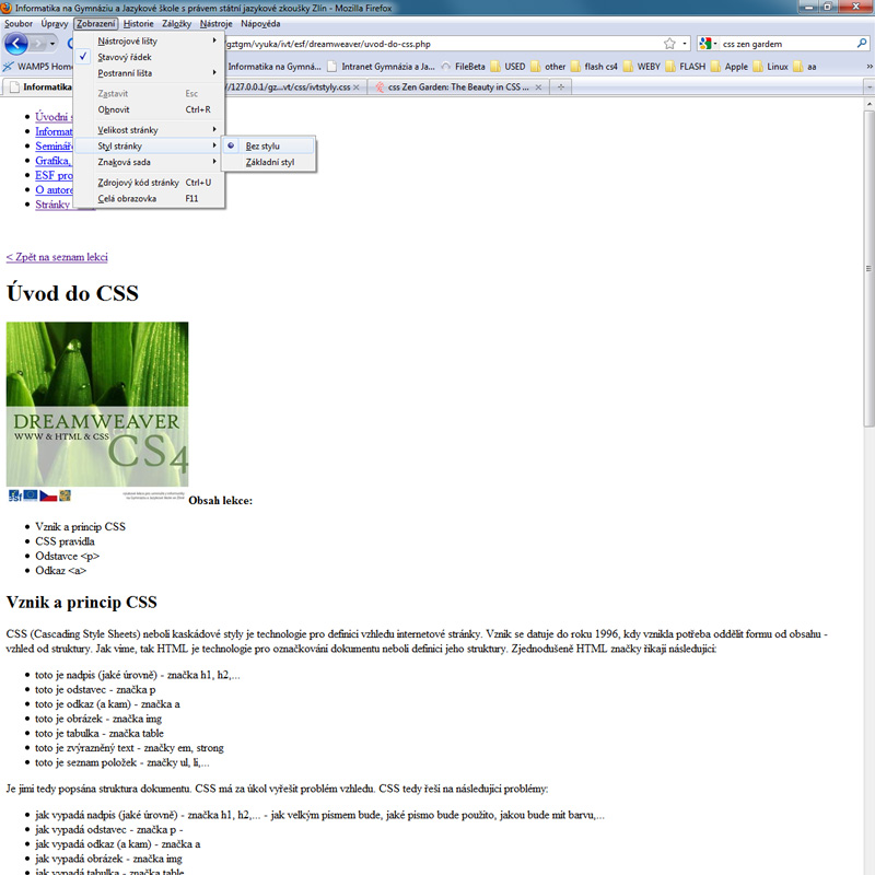 Sami si můžeme prohlédnout libovolnou internetovou stránku (strukturu bez css) snadno například v prohlížeči Firefox tak, že v menu Zobrazení vybereme položku Styl stránky a zvolíme bez stylu.