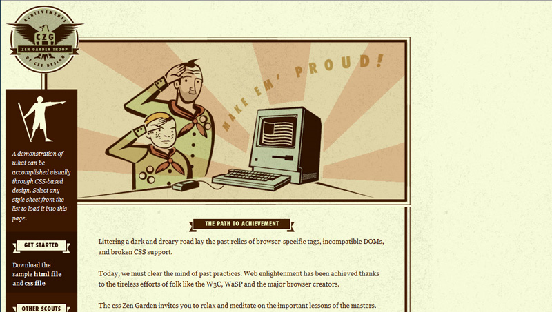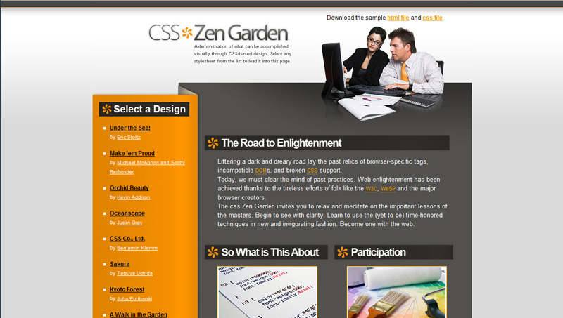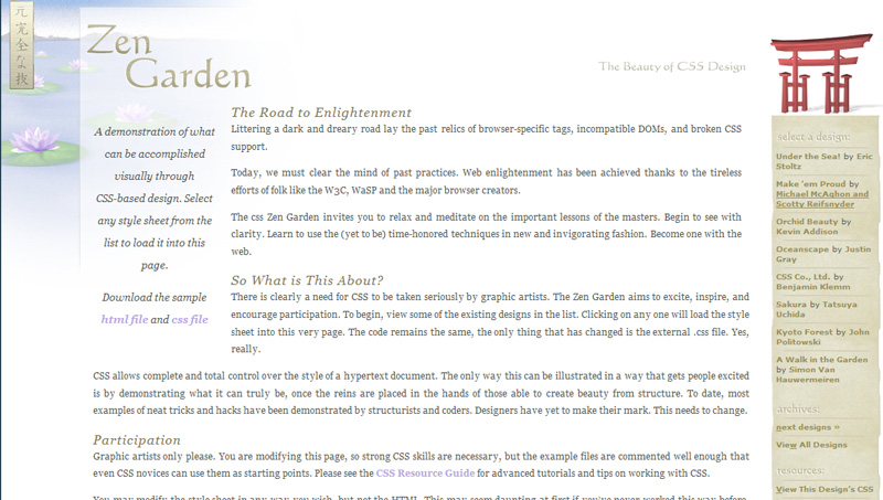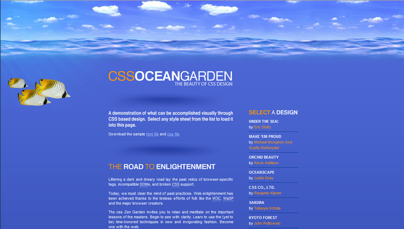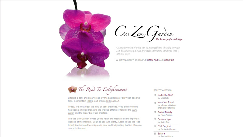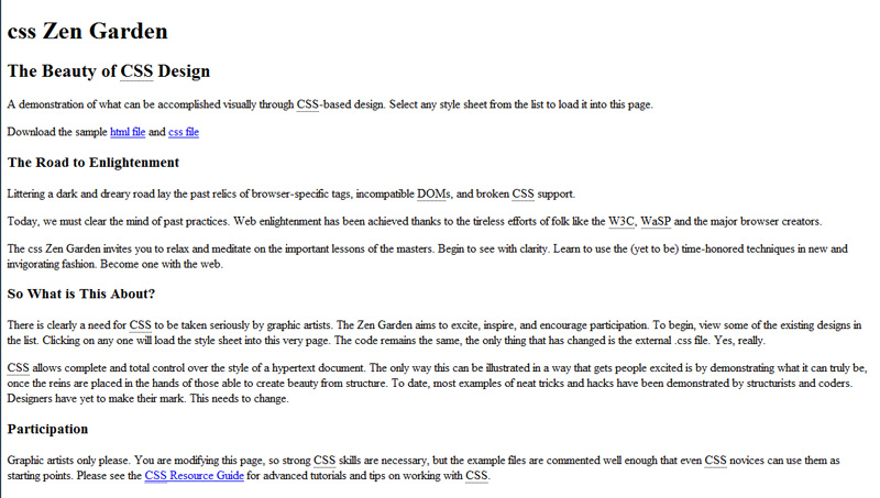 Než se pustíme do výkladu problematiky CSS, tak se podíváme na stránky http://www.csszengarden.com/. Na těchto stránkách je ilustrován obrovský potenciál CSS, která dokáže pro nadefinovaný html dokument pouhou změnou vkládaného CSS souboru v hlavičce ZCELA DRAMATICKY měnit vzhled celého webu (stačí klikat na různé polžky menu "select a design"). Podívejme se, co lze například změnou jediného řádku (vloženého CSS souboru) dosáhnout: