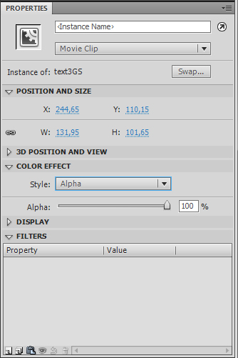 Zde vyuijeme jin efekt, a to sice prhlednost. Pepneme se do snmku 100, ozname symbol s textem 3DS a vpravo v panelu Properties, pod zlokou Color Effect vybereme styl Alpha a nastavme hodnotu na 0. Tmto doclme efektu, kdy text od 100. snmku bude postupn vystupovat a do snmku 129, kdy bude pln vidt.
