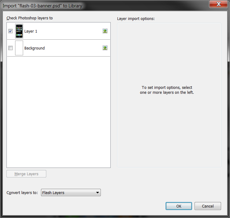 Soubor ulome a v programu Adobe Flash Professional zvolme poloku Import to Library (z menu File>Import). Pokud importujeme soubor z Adobe Photoshopu, mme k dispozici vbr, kter vrstvy chceme importovat zvolme tedy pouze vrstvu s iPhonem bez jakhokoli pozad.