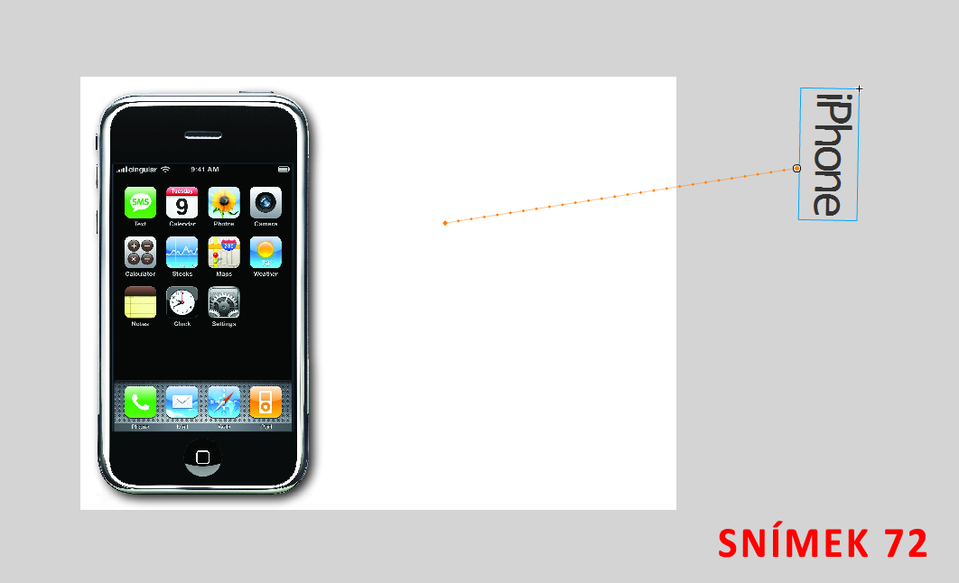 Zaneme vytvoenm nov vrstvy pro text iPhone (pojmenujeme ji text), vytvome klov snmek (F6) na pozici 72, take vechny snmky 1-71 zstanou przdn. Dle pidme text iPhone napravo od mobilu, pouijeme vhodn bezpatkov font, napklad Calibri. Velikost zvolme kolem hodnoty 50 a pouijeme tmav edou, poppad tm ernou barvu.