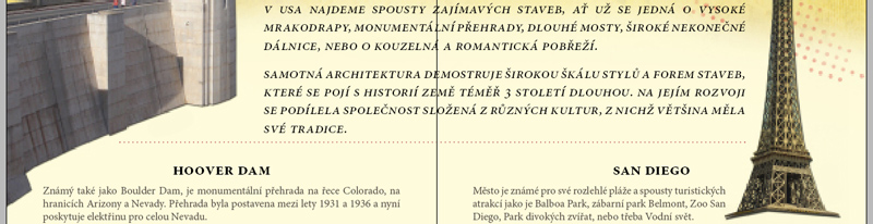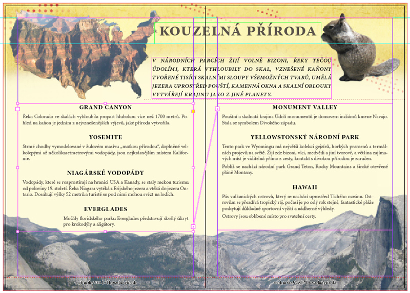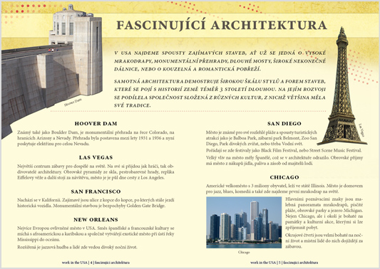 Na dvojstraně s přírodou přidáme dva popisky (Grand Canyon, veverka), u architektury tři popisky (Hoover Dam, Las Vegas - věž, Chicago - vložený obrázek) a u společnosti dva popisky (mezinárodní společnost,