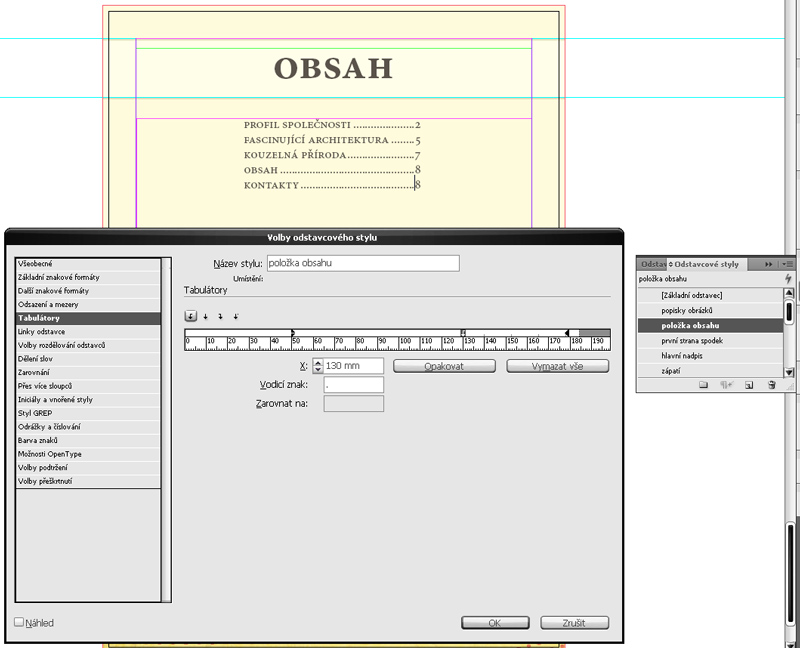 Generování obsahu pracuje tak, že najde v dokumentu všechny výskyty zvolených stylů a vytvoří finální obsah do místa, kde určíme. Obsah je samozřejmě tímto způsobem zpětně editovatelný. Při volení stylů vybereme styl hlavní nadpis a nastavíme pro text, kterým bude obsah vykreslen, Styl položky na nový styl. Po potvrzení již vidíme obsah hotový a zbývá jen použít Tabulátory pro pozicování textů a stránek, vhodné je také případné použití vodicího znaku. Obrázek pod textem ukazuje, jak by měl vypadat výsledek.