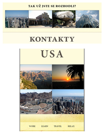 Všechno pozadí je prozatím hotové, takže se přesuneme na titulní stranu. Ta by měla obsahovat jasný a výstižný nadpis příjemné barvy. Dále přidáme 4 fotografie a dolů vypíšeme hesla pro daný studijně-pracovní pobyt. Všechny tyto akce ilustruje následující video, pod kterým je popis a vysvětlení.