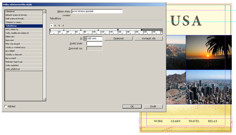 Abychom docílili rovnoměrného rozmístění spodních slov, použijeme Tabulátory. Ve volbách Odstavcového stylu je záložka pro tabulátory, kde lze nastavovat tabulátory obdobně jako v programech typu Word apod. (možnost zarovnání vlevo, středového, vpravo). Výsledné rozmístění by mělo odpovídat obrázku pod tímto textem.