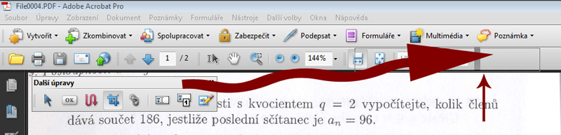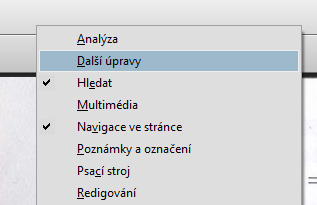 Pokud tuto ikonu v nabídce nevidíme (není přítomen panel, ve kterém je obsažena), pak na horní lištu s panely klikneme pravým tlačítkem myši a z nabídky vybereme položku Další úpravy.