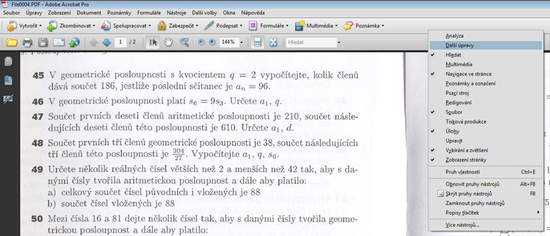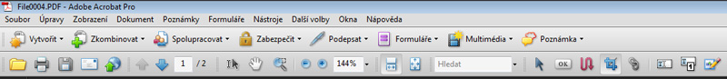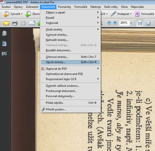 - Poklikáním na soubor jej otevřeme v programu Adobe Acrobat (pozor, nejedná se o běžný Adobe Reader), který nám umožní převést obrázek v PDF souboru na text. V případě, že máte předlohu naskenovánu převráceně, pak je dobré naskenovaný dokument otočit v požadovaném směru v programu Adobe Acrobat (menu Dokument > Otočit stránky).
