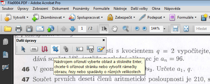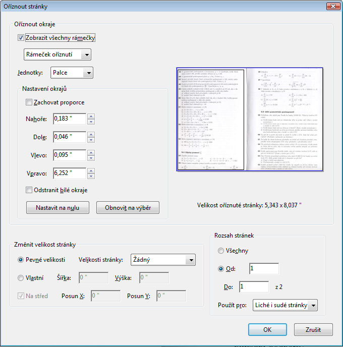 - Jakmile máme ořezový obdélník vytvořen, tak stiskneme klávesu Enter (všimněte si na jednom z obrázků výše, že pokud najedeme kurzorem myši nad ikonku nástroje, tak se po chvilce zobrazí malý žlutý obdélník s krátkou nápovědou o daném nástroji). Pokud tedy nevíte, co která ikonka znamená, tak se to takto stručně lze dovědět. Po stisku klávesy Enter by se mělo objevit okno jako na následujícím obrázku. Zásadní je zde v podstatě pouze opět volba Rozsah stránek, kde si můžete stejným způsobem ořezat všechny stránky dokumentu nebo každou jinak dle potřeby. Celý proces oříznutí dokončíte stiskem tlačítka OK.