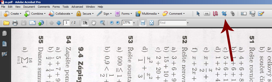 - Nyní je – v případě potřeby – dobré „ořezat“ v obrázku požadovaný text (často se stane, že jsou na obrázku například kusy sousedních stran, okraje knihy apod.). Jde nám o to, že chceme na každé straně mít jen obdélníkovou část obsahující požadovaný text. K tomuto účelu slouží nástroj oříznutí (viz ikona na následujícím obrázku).