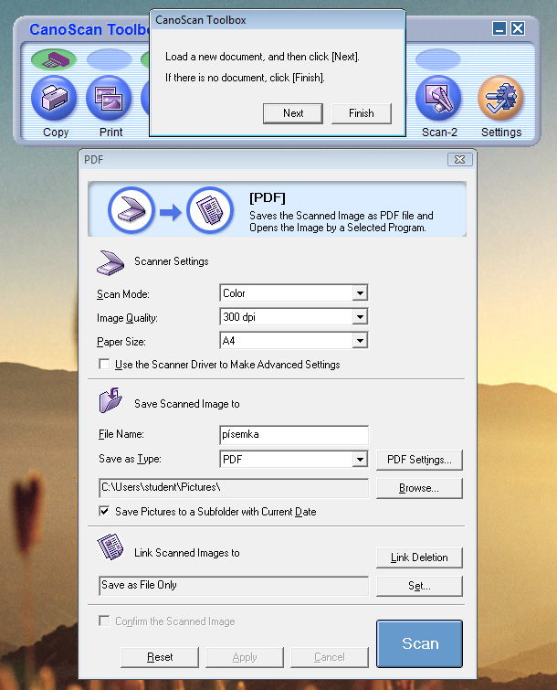 - Na skeneru stiskneme tlačítko PDF (analogicky můžeme použít software pro skener)