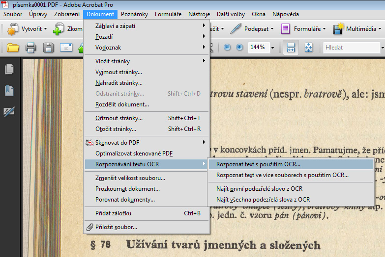 - Nyní již máme dokument připraven pro samotný proces rozpoznávání textu. V nabídce Dokument vybereme položku Rozpoznání textu OCR > Rozpoznat text s použitím OCR…