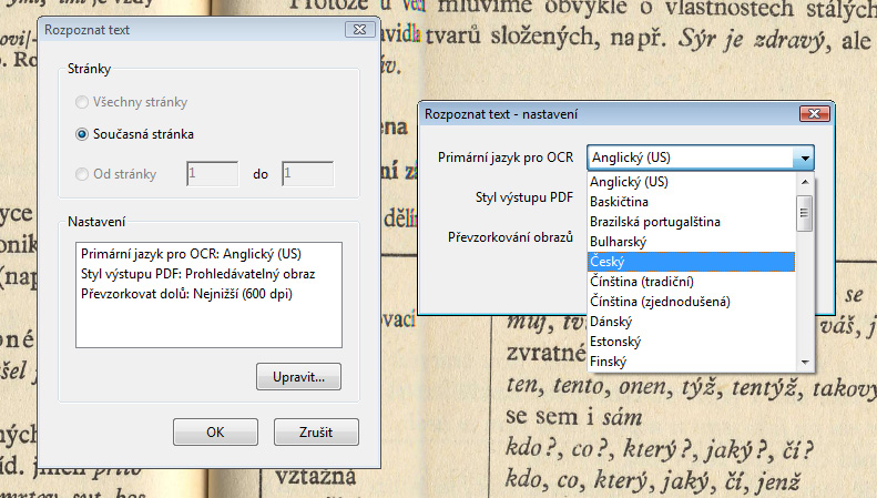 - Zobrazí se okno s volbami pro rozpoznávání. V něm je důležité zvolit požadované stránky, ve kterých chceme text rozpoznat a zkontrolovat nastavení. V nastavení je podstatná především položka udávající primární jazyk (jazyk zvolíme tlačítkem Upravit…). Samotný proces převodu spustíme v okně „rozpoznat text“ kliknutím na tlačítko OK.