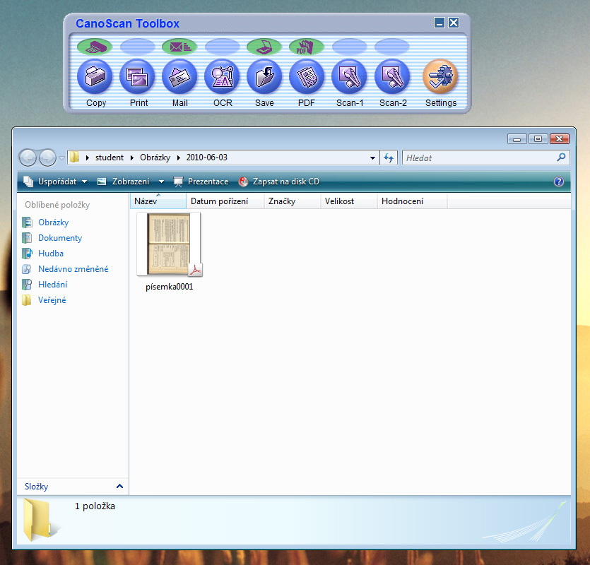 - Po naskenování dokumentu vznikne soubor ve formátu PDF, který se uloží pod definovaným jménem (položka File Name) na pevný disk počítače (z obrázku výše vidíme, že do složky C:\Users\student\Pictures). Po naskenování se nám ale objeví okno průzkumníka s naskenovaným souborem, takže jej nemusíme sami vyhledávat (viz následující obrázek).