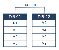 Nejjednodušší implementací diskových polí RAID je RAID 0, někdy označované jako prokládání (anglicky „stripping“). Na takové diskové pole jsou data ukládána po menších blocích střídavě na jednotlivé disky.