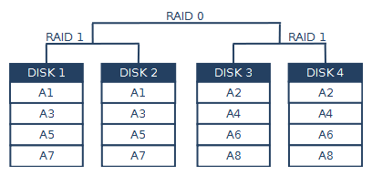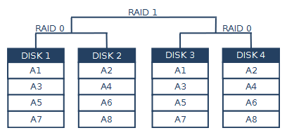 Pole RAID 0+1 je tvořeno dvěma poli typu RAID 0, které jsou propojeny do pole typu RAID 1. Způsob ukládání dat v takovém poli shrnuje následující obrázek.
