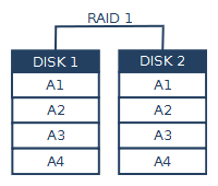 Diskové pole RAID 1, které je označováno také jako zrcadlení (anglicky „mirroring“) vyžaduje pro svůj chod sudý počet pevných disků. Data jsou v tomto případě ukládána duplicitně na dva disky současně (stejná data se nachází na obou pevných discích).