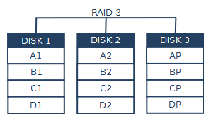 Diskové pole RAID 3 pro svůj provoz potřebuje minimálně 3 pevné disky. Jeden je použit pro paritní data, zbylé disky (minimálně 2) jsou použity pro data. Výhodou tohoto řešení je detekce a oprava chyby – v případě chyby jednoho z disků lze data, na základě informací ze zbylých disků, bez problémů obnovit. Nevýhodou je nemožnost využít celou kapacitu diskového pole – vždy je jeden disk blokován pro paritní data.