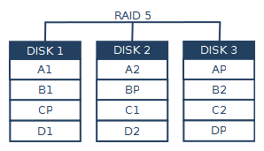 Diskové pole RAID 5 je založeno na stejném principu jako RAID 3 s tím rozdílem, že paritní data se ukládají střídavě na různé disky (kontrolní součet není pouze na jednom disku, jako v předchozím případě). Toto řešení mírně zvyšuje výkon (paritní data nejsou pouze na jednom disku, takže jeden disk není přetěžován opakovaným zápisem). Další výhody i nutné podmínky jsou již shodné s RAID 3.