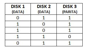 Pozn. Parita je dopočítána dle výše uvedené tabulky pro exkluzivní logický součin. Při použití více pevných disků by se parita vypočítávala postupně (nejprve logických součin prvních dvou hodnot, následně přidání další hodnoty). Například na prvním řádku jsou data s hodnotami 0 a 1 a výsledek exkluzivního logického součtu je 1, na paritní disk se tedy ukládá hodnota 1.