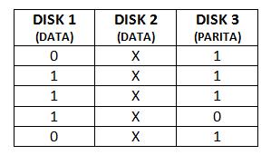 Pozn. Data na poškozeném disku jsou nahrazena znakem „X“, za který budou dopočítána data. Například na prvním řádku tabulky je na prvním disku uložena hodnota 0, na druhém disku je hodnota poškozena a paritní disk obsahuje hodnotu 1. Obnovená data tedy budou výsledkem operace 0 XOR X = 1 a podle tabulky pro logický součin je získána hodnota X.