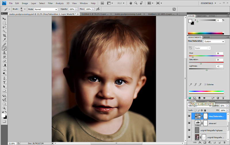 Další úpravou bude změna odstínu fotografie. Opět použijeme vrstvu úprav (tentokrát systost a odstín). Upravíme dle našich představ a pokud chceme zachovat původní barvu očí, pak je opět pomocí masky vyloučíme mimo působnost filtru. Opět lze experimentovat a nastavovat různé režimy prolnutí vrstev a jejich viditelnost (použili jsme "tvrdé světlo" a průhlednost stanovili na 80%).