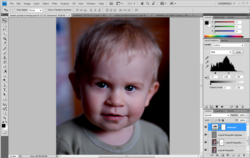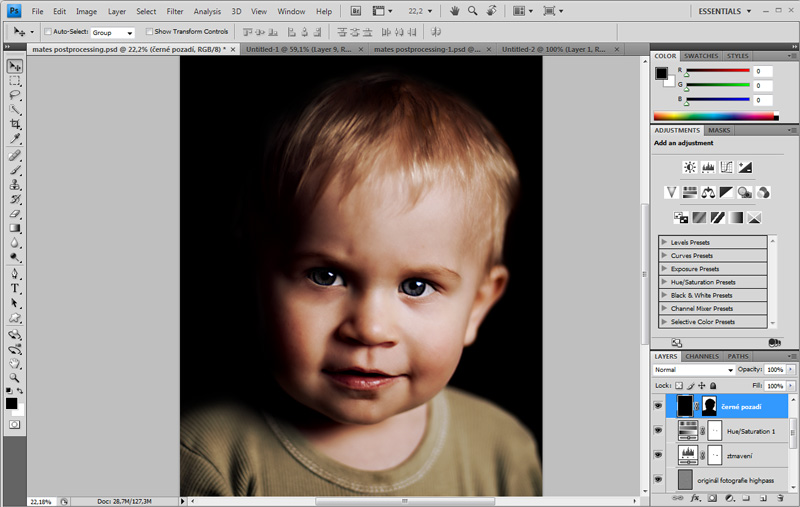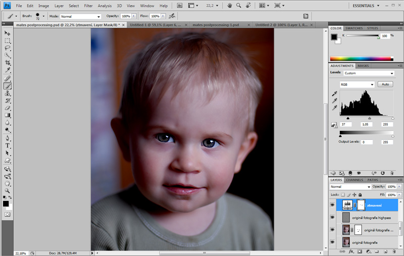Vidíme, že nám ztmavení obrazu příliš ztmavilo oči (ty by měly zůstat živější a světlejší). Proto je pomocí masky vyčleníme z obrazu jako část, které nebude vrstvou úprav vůbec zasažena. Prostě je vybervíme černým štětcem v masce vrstvy úprav.