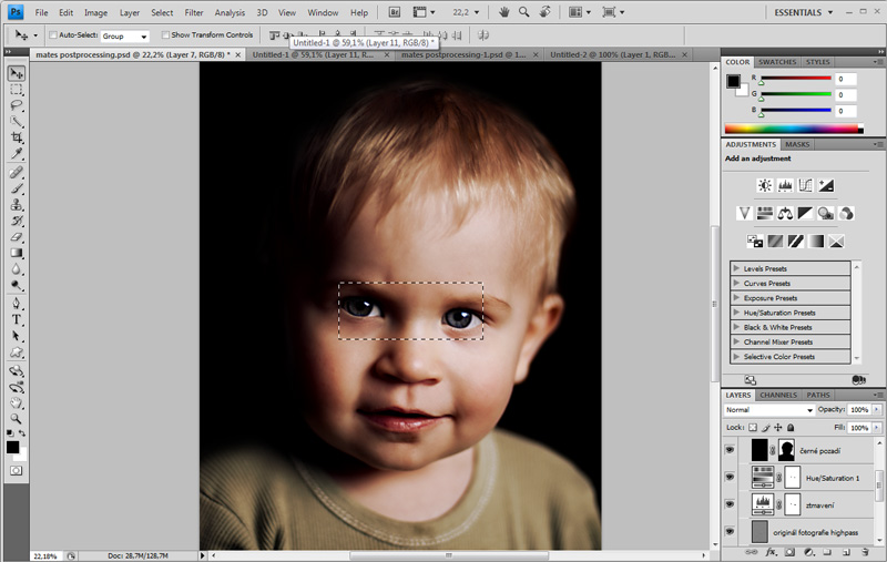 Poslední věcí, která se používá při postprocessingu portrétů, je dodání "živosti" a světlosti do očí. Zde si ukážeme dvě možná řešení. První z nich spočívá v tom, že definujeme obdélníkový výběr a pomocí klávesové zkratky CTRL+SHIFT+C si do schránky počítače nakopírujeme obdélník obsahující oči a vložíme jej do fotografie. Vznikne tak nová vrstva tvaru obdélníku obsahující oči.