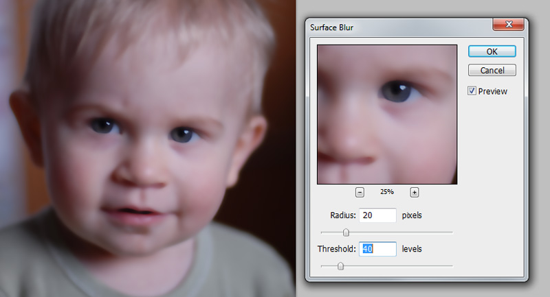 Nyní opět zduplikujeme upravenou vrstvu a pojmenujeme ji "originál fotografie vyhlazení". V menu fitry vybereme ve skupině "rozmazání" filtr "rozmazání povrchu". Zvolíme vhodné hodnoty (kdykoli později můžete tento krok opakovat a dojít k lepším výsledkům) pro vyhlazení (rozmazání) pleti.