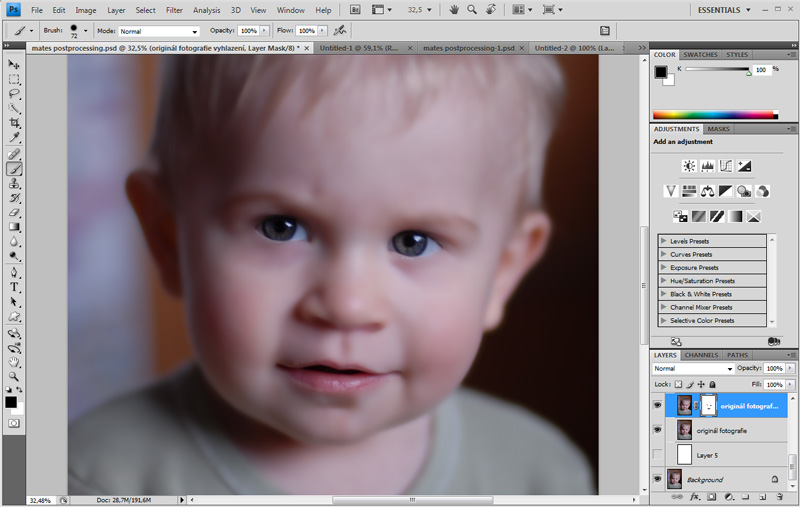Ve vrstvě s rozmazaným obrazem vytvoříme masku vrstvy, zvolíme černou barvu štětce a vykreslíme oblast očí a rty. Tímto dosáhneme toho, že portrét bude vyhlazen, ale oči a rty zůstanou ostré (samozřejmě zde můžete na rty použít částečně průhledný štětec, abyste zjemnili ostrost, ale u očí ji určitě nechte maximální možnou).
