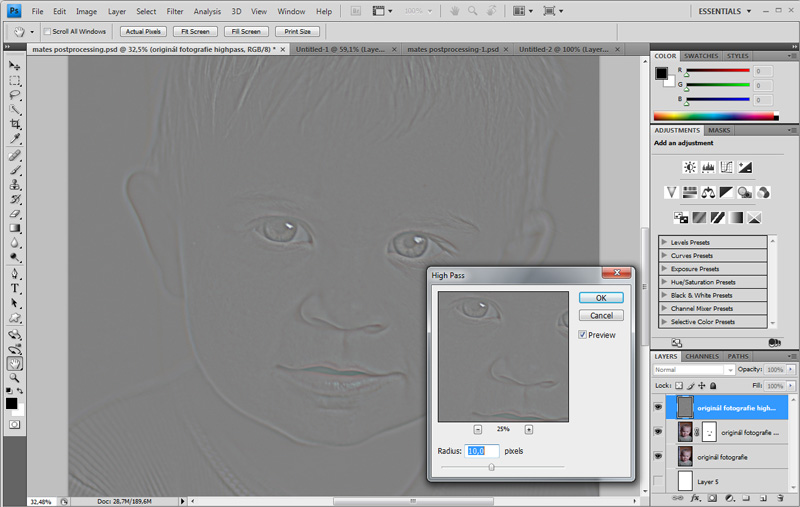 Nyní zduplikujeme vrstvu "originál fotografie", pojmenujeme ji "originál fotografie highpass" a myší ji přesuneme nad vrstvu "originál fotografie vyhlazení". V menu filtry vybereme ve skupině "ostatní" položku "horní propust" a nastavíme vhodně parametry. Jde nám teď o to, abychom získali ostré kontury obrazu. Až budeme hotovi, tak filtr aplikujeme stisknutím tlačítka OK. Tento krok lze opět opakovat v budoucnu a najít ideální nastavení pro naši potřebu.
