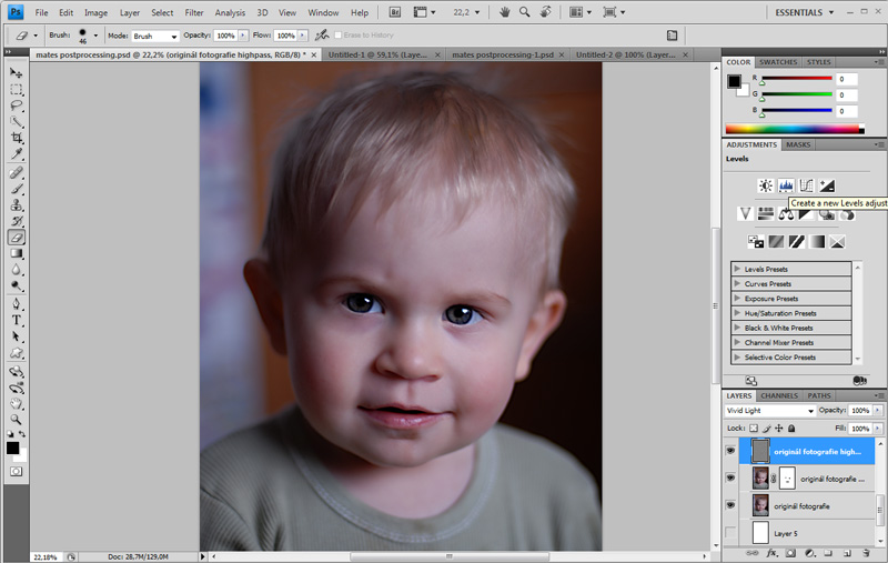 V tomto kroku vytvoříme tzv. "vrstvu úprav". Jedná se o vrstvu, ve které nastavíme nějaký typ úprav obrazu a ta nám bude témito nastavenými úpravami ovlivňovat vzhled vrstev pod ní. Vybereme v panelu vrstev úprav vrstvu úprav úrovní. Tento způsob ovlivnění vzhledu obrazu má zejména tu výhodu, že je možné jej kdykoliv zrušit, či změnit a netýká se tak defnitivní úpravy některé konkrétní vrsty. Opět lze experimentovat a hledat ideální nastavení. Je možno si zřídit větší množství těchto vrstev pro konktrétní situaci (kandidátů) a dle libosti je zapínat/vypínat a hledat tu ideální (třeba i kombinaci několika).