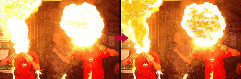 Ve druhém případě fotografie zachycuje vystoupení dvou barmanů. Na fotografii jsou plameny a díky jejich intenzitě jsou na původní fotografii (levá část obrázku) prakticky bez kresby (jen bílé skrvrny). V tomto případě bylo k vylepšení fotografie použito klonovací razítko a vnitřek plamenů ztmaven, aby byla více vidět struktura ohně.