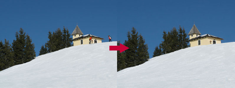 Upravte fotografii lyzari-v-alpach tak, abyste lyžaře zcela odstranili. Výsledek vidíte na dalším obrázku.