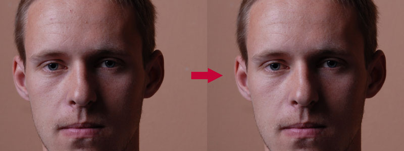 Podívejme se nejprve na část původní fotografie a její lehkou úpravou pomocí bodového retušovacího štětce. Na levé části obrázku vidíme (zejména v levé polovině čela a pod nosem) pleťové nedokonalosti. Pomocí několika kliknutí jsme obdrželi retušovanou fotografii (pravá polovina obrazu).