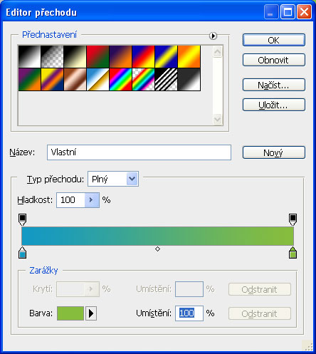 Následně vytvoříme novou vrstvu, přesuneme ji do pozadí a aplikujeme na ni lineární přechod. Máme možnost si buď vybrat z přednastavených přechodů, nebo si je modifikovat či vytvořit vlastní přechod - to bude náš případ. Nastavení barev je v následujícím obrázku: